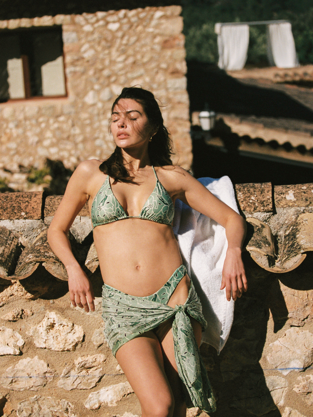 Relax in the softness of our luxe eco swim range- Wollemi. Designed in the viral triangle bikini silhouette you all know and love, this mint green metallic print will elevate your look. It features removable, padded cups for a lightweight, form-fitting feel. Fits true to size.